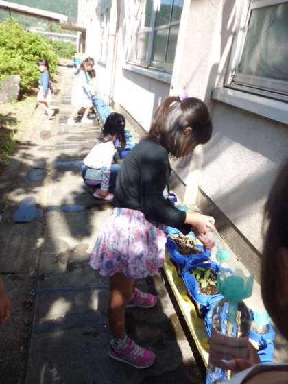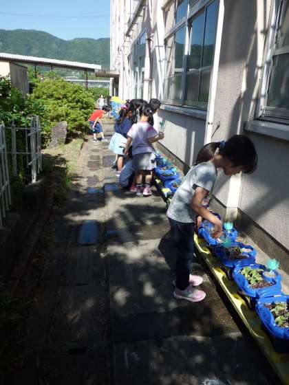毎朝,あさがおの水やりをしています。どの子も,ふたばがしっかりと開いて大きくなったことや,さらに葉が出てきたことに気づいて喜んでいます。