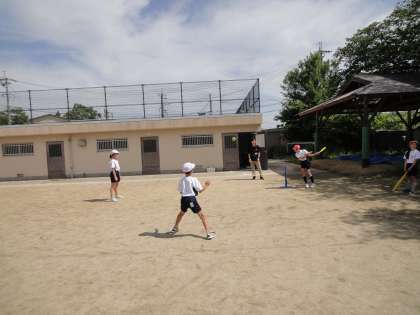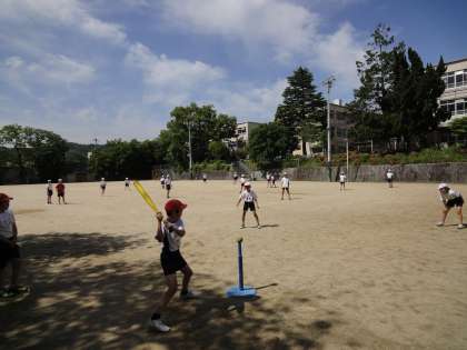 体育の学習で,ベースボールを運動場で行いました。子ども達は,打って,走って,守って,楽しみました。守備はまだまだ慣れていない様子ですが,みんなしっかりと打って活躍していました。次も楽しみです。