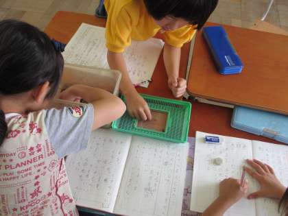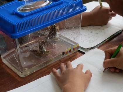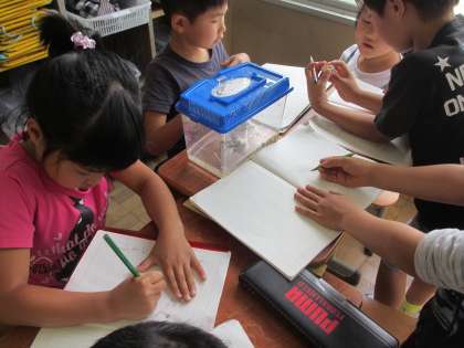 国語「かんさつ名人になろう」の学習で,生き物を観察して様子を記録しました。ザリガニやカエルなどをじっと見ながら,大きさ・色・動きなどの様子を書きました。