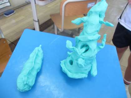 手や指を工夫して使い,ねんどをにぎったり,引っ張ったりしながら,形を変えて,いろいろなものを作って楽しみました。たくさんのおもしろい作品ができあがりました。