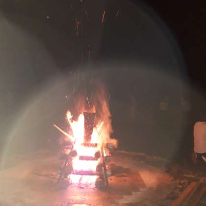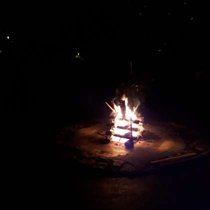 今,キャンプファイヤーの最中です。雨も降らず,屋外の営火場で楽しく盛り上がっています。