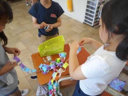 かざり係さんが,素敵なかざりを考えて作っていました。季節に合わせたかざりが増えてきました。今回は輪っかをつなげて,長い長い!この長い輪っかをどこにかざるのか,先生に相談してくださいね!