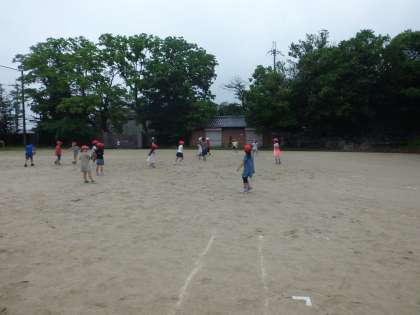 雨がやむと,運動場に出て元気に遊んでいます。運動場でおにごっこをして遊んでいました。