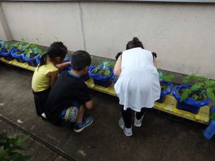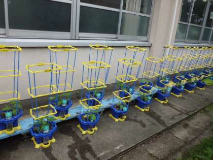 あさがおの本葉が出てきて大きくなりました。まず肥料を入れました。その後に,友達といっしょに助けあって支柱を立てました。どんどん大きくなるのが楽しみです。