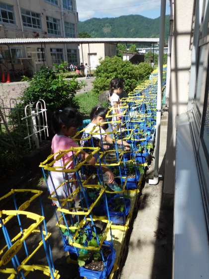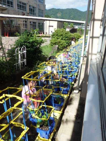 あさがおの水やりをがんばってしています。つるがのびてきたとうれしそうに話しながらしていました。