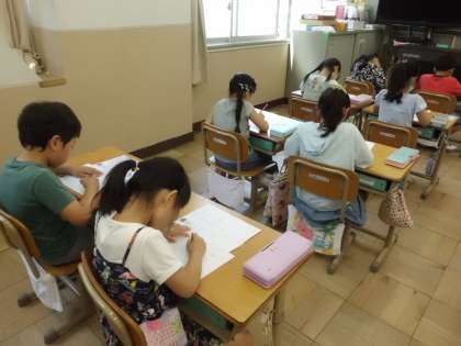 お手本を見て,字の形に気をつけて,ていねいに書いています。姿勢やえんぴつの持ち方にも気をつけるよう声をかけています。