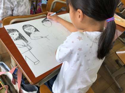 図工で『みさきの家での思い出』について,特に思い出に残った場面を絵に描いています。友達と協力した野外炊事・みんなの心が一つになったキャンプファイヤー・かわいいジュゴンがいた鳥羽水族館などそれぞれの思い出を描きました。今度は絵の具を使って色をつけていきます。
