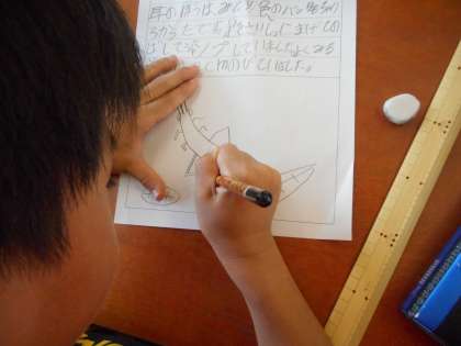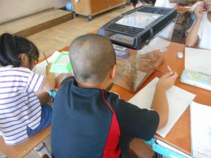 ダンゴムシやバッタ,見つけてきた小さな虫をよく見て観察カードにかきました。「ジャンプするときに足を曲げてから飛んでいる。」や「ダンゴムシの裏側は白い。」など,カゴに顔がくっつくほど近づけて観察していました。大切に育ててほしいです。