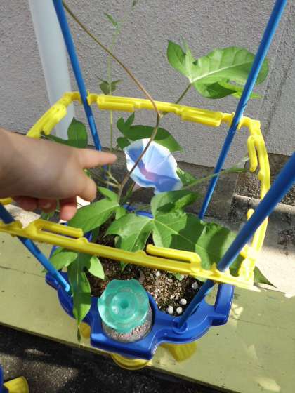 朝にあさがおの観察をしに行くと,花が咲いている鉢がありました。「先生!大きな花が咲いている!」と見つけた子どもたちが大喜びでした。