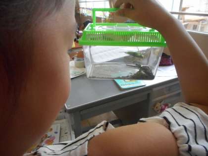 大きなキリギリスが仲間に増えました。休み時間になると,葉っぱを入れ替えたり,水を葉っぱにつけて置いたり,キリギリスの住みやすい環境を考えていました。また,図書館に行って,詳しく調べようとする姿もあり,小さな仲間を大切にしています。