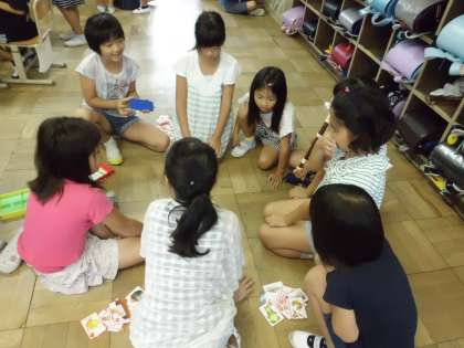 「ハイ!!」と元気な声が響き渡っています。楽しそうにことわざカルタをする姿。楽しくことわざを覚えられるといいな。