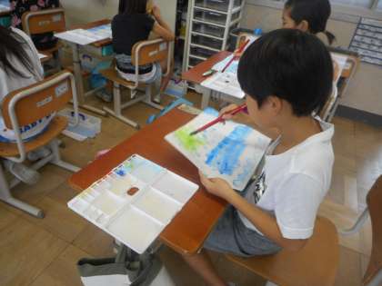 図画工作の学習では,絵の具の使い方を練習しました。水の量によって色の濃さが変わるのを確かめていました。濃いところからだんだん薄くなるように,水の量を調節しながら活動していました。終わったら,早くできた人が率先して床を拭くなど,協力して後片付けもできました。