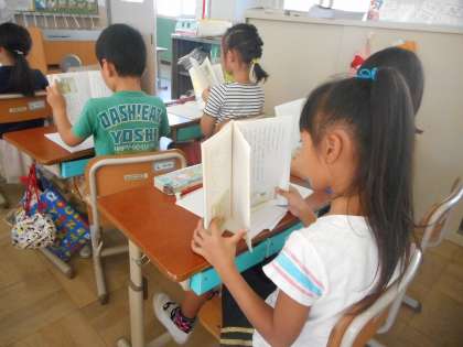 国語の授業では「お手紙」の学習をしています。一人読みの時間では,繰り返し読み返しながら,心に残ったところや面白かったところに線を引いていきます。一人ひとりが,一人で考える時間。集中しています。