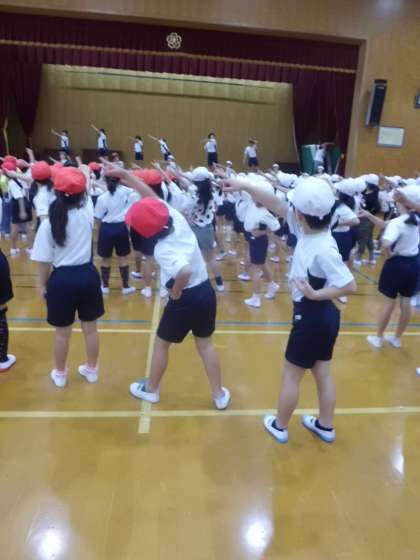 運動会の全校ダンスの練習を行いました。「笑一笑〜シャオイーシャオ〜」の曲に合わせて,元気に踊っていました。高学年の係の人の見本を見ながら楽しく体を動かしていました。