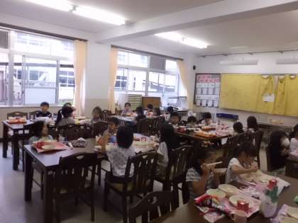 ランチルームで給食を食べました。テーブルごとに楽しく話し,いい雰囲気でした。食べ終わった後は,おぼんをふきんでふいたり,テーブルを台ふきでふいたりと後片付けもきちんと行えました。