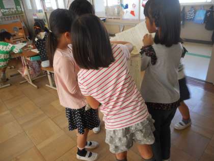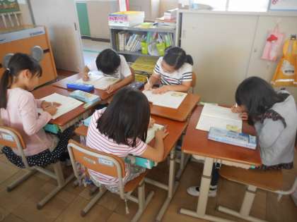 音読の工夫を考えて,教科書に書きこんでいきました。早速,みんなで簡単な体の動きや声の大きさを実践してみたり,一緒に読むところを増やしたり,工夫しながら楽しそうに練習していました。