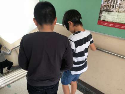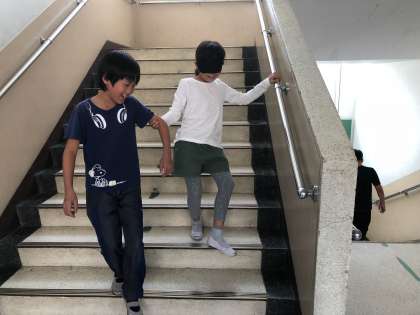 総合的な学習の時間に『アイマスク』の体験をしました。目の不自由な人の気持ちを考えることができました。「補助の人に階段終わりって言ってもらっても,見えないと不安な気持ちになる。」「小さな段差でも怖かった。」などといった感想を子どもたちは書いていました。普段何気なく生活している学校も,目の不自由な人にとっては不便なところがたくさんあることに気が付いていました。