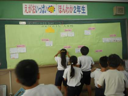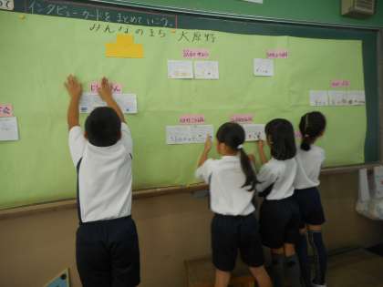 生活科の学習では,インタビューしたことをまとめています。まとめたものを貼っていくと,大原野の地域にはたくさんの建物があることに気付いていました。