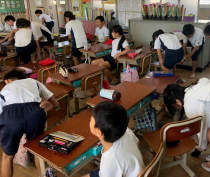 保健係が靴下脱ぎはき競争を企画してくれています!体幹がしっかりしているとふらふらせず,早く履くことができます。今回は32秒だったので次回はそれをさらに縮めていきましょう!