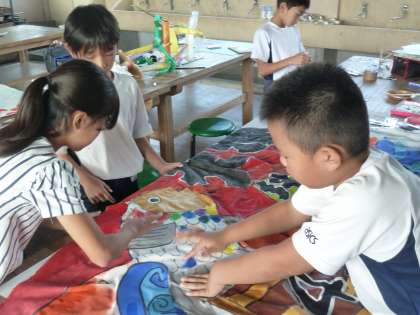子どもたちが運動会のためにデザインから頑張って製作した大漁旗がついに完成しました!全員の熱い思いをこめて,一人一人自分の好きなカラーを指でうろこに塗ったり,手形を押したりしました。とってもすてきな旗が完成したので,当日どうぞお楽しみに!