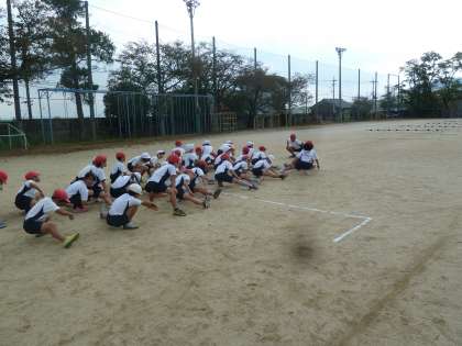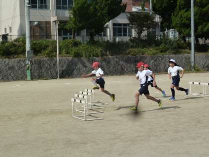 4年生になり,初めて挑戦したハードル走。毎日練習を重ね,だんだんと形が身についてきました!遠くから跳びきる,抜き足は曲げて横に向ける,上体を倒すことを意識して頑張っています。準備体操もテンポよくできるようになってきました。