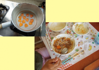 ハッシュドビーフは給食調理員さんがルウから手作りして作っています。小麦粉とバターと油から作られていて,白っぽい色から濃い茶色になるまでじっくり混ぜながら仕上げてくださっています。今日はハッピーキャロットも入って,子どもたちも楽しんで食べていました。