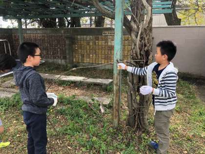 図画工作科で造形あそびをしました。今回は木やぼうなどの材料をどんどんつなぎ,組み合わせ方を工夫すると,どんな形になるのか想像しながら取り組みました。班ごとに張り切って材料を集め,みんなで協力しながら麻ひもを使って木と木を組み合わせていきました。班によってさまざまなおもしろい形ができました!
