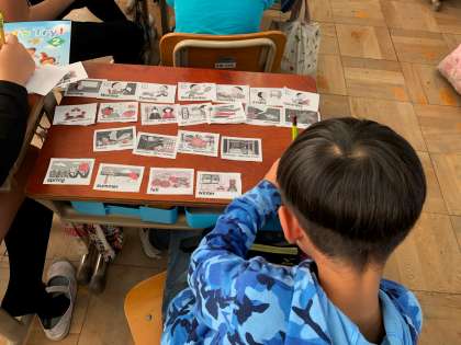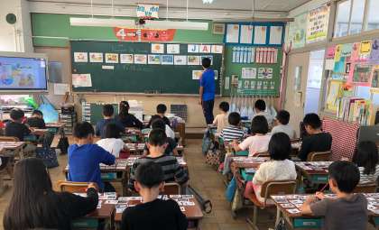 外国語活動ではいつも楽しくがんばっています。この日は,何月かを英語でいう言い方を確認しました。月のカードを机に並べ,近藤先生の言葉と同時にどの月のカードかをかるたのように取り楽しんでいました。12か月全部覚えられるといいですね!