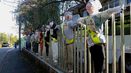大原野小学校2年生が作ったかかしが,会場の入り口で来場者を出迎え,交通安全を呼び掛けていました。