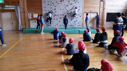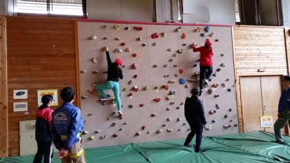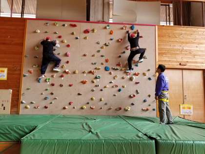 クライミングに挑戦しています。登るより降りる方が難しかったようです。