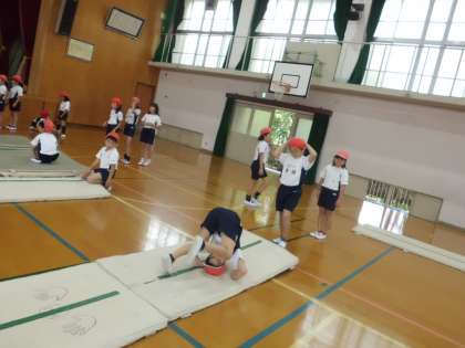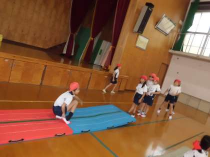 マット運動の時間です!ねらい1は,「今できる技を連続して取り組もう。」です。線に沿ってまっすぐできるように練習しました☆
