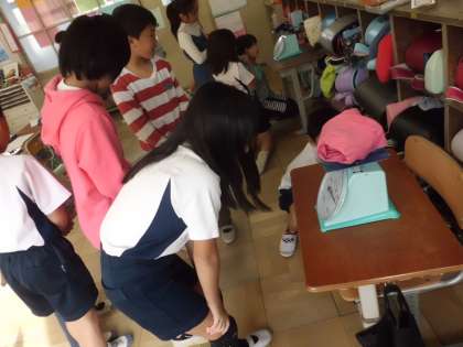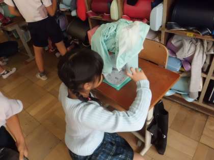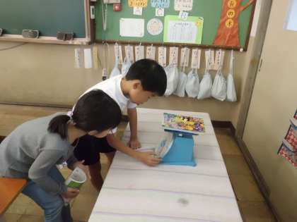 重さの学習で,どのように目盛りを読めばいいのか,どうして1目盛りがいくつかわかるのかをみんなで話し合い,共有しました。そのあと,実際に1キログラムばかりを使って,身の周りのものを量りました。振り返りのノートでは,「予想より重かったり軽かったりしておもしろかったです。」「1キログラムばかりでは量れないものがあることがわかりました。」など,見当づけて量っている様子や,量れないものはどうすればよいか,という新たな問題を自分で見つけている様子が見えました。問題をみんなで解決していこうとする心を育てていきたいです。