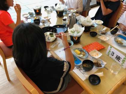 6時半に起床しました。朝食です。今日も沢山の活動があるので,しっかり食べて,元気に活動します。全員元気にしています。