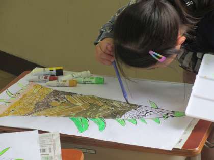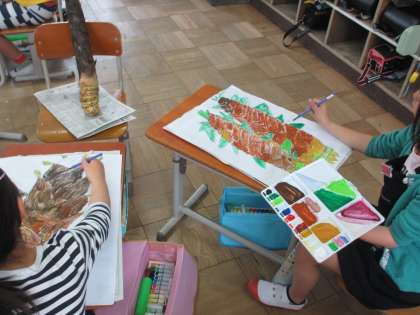 下描きした,たけのこの絵に絵の具で着色しました。たけのこをじっくり観察しながら,絵の具を混ぜて,色々な色を作って着色し,個性豊かなたけのこの絵が出来上がりました。
