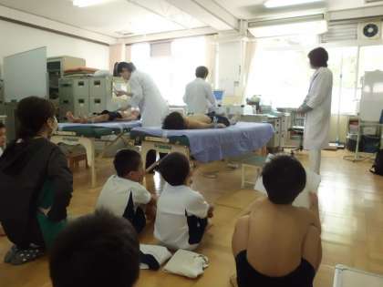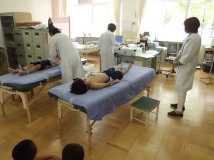 1年生の心電図検査がありました。初めての経験で,胸に6か所,両手足に4か所の電極を付けられ,ドキドキ緊張した様子がみられましたが,友達が検査を受けている様子をみて安心したのか,上手に受けることができました。また,待っている時も,ルールを守り,静かに待つことができました。1年生,頑張っています!