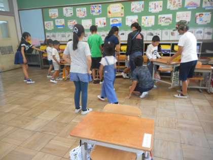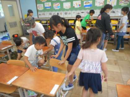 6年生が教室の掃除を手伝いに来てくれています。1年生は,どんなふうに掃除をしているのか,しっかり見て学習しています。机運びのお手伝いをすることになりました。6年生が丁寧に教えてくれて,とても感謝です。