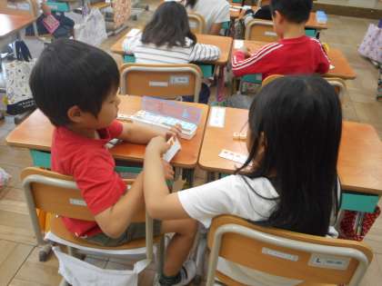 算数では「いくつといくつ」の学習をしています。数図ブロックや数図カードを使って,ゲームをしました。友達が出した数図カードを見て,あといくつで8になるのか,分からないときは,数図ブロックを使いながら,活動をしていました。