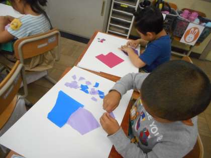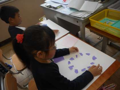 図画工作科の時間には,あじさいを折り紙で作成しています。手でちぎって,のりで貼って,すてきなあじさいがたくさんできました。葉っぱや虫,自分も描いていきます。完成が楽しみです。
