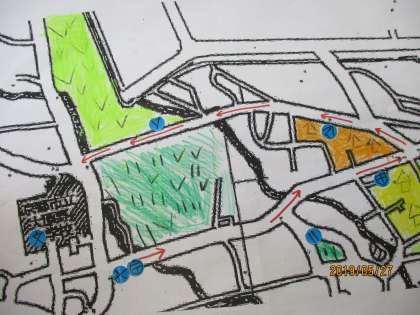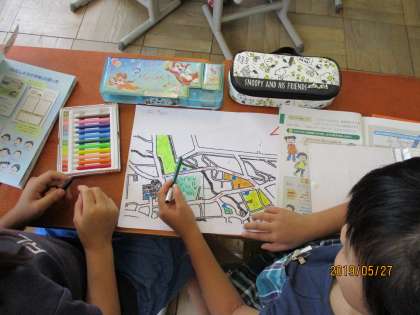 今まで校区探検に行って実際にみたまちの様子を交流してきた子どもたち。その様子をどうすればわかりやすく地図に表すことができるかを話し合いました。そこで地図記号と色をつけて見やすい地図を作ることができました!