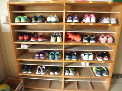 雨で少し湿った靴,長靴・・・それでも,きらきらに整理された靴箱。