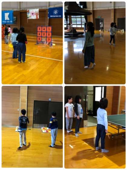 雨のため,プレイホールで選択スポーツの活動です。ストラックアウト,バドミントン,輪投げ,卓球です。自分たちでルールを決め,みんな仲良く,各スポーツを楽しんでいます。
