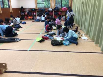 りんごジュースでのどを潤したあとの,ほっこりタイム。野外炊飯の予習をしている子どもたちも見られます。確実に昨日より成長がみられます。