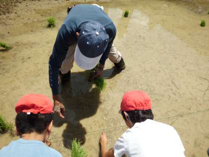 地域の「米作り先生」に丁寧に教えていただいて,貴重な田植えの体験をすることができました。秋には立派な稲穂になるのを心待ちにしている子どもたち・・・。
