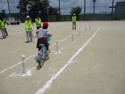 それからジグザグのコースやゆっくり走るコースを体験しました。なかなか障害物を避けながらの走行は難しそうにしていましたが,とても達成感があったようです。今日学んだことを実生活でも活かし,安全に自転車に乗ってほしいと思います。