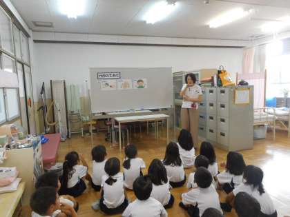 保健室では,養護の先生から「けがの手当て」についてお話してもらいました。けがをした後,どうしたらいいかなど,しっかり話を聞きました。
