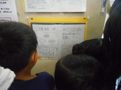 「今日の給食はなにかな?」子どもたちは,献立を毎日見て確認しています。「おいしい!」「おふやし!」と,毎日,おいしい給食を作っていただき,ありがとうございます。