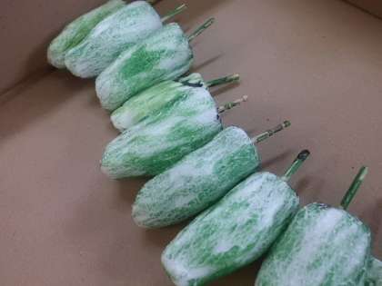 たけのこファームで育てた野菜をよく観察すると,野菜によって花の色が違ったり,実の付き方が違ったりしました。観察したことを,身近な空き箱や画用紙などを使って野菜作りをしています。果たしてどんな野菜ができるのかな?でこぼこした「ししとう」の形を上手に表していました。