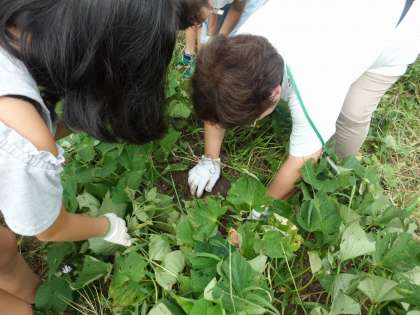 さつまいもの周りの雑草を抜いていると,「あれ?土の中から,さつまいもが見えているよ。」と発見してくれました。土の中に隠れているので,できているか不安でしたけど…。今日よく見ると立派なさつまいもができていました。収穫が楽しみになりました。