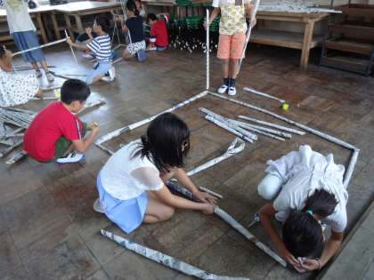 「あっ!ここを支えないと」「なかなか立たないな…。」「どうしよう・・。」「そこを支えておいて!」と飛び交う子ども達の声。班で声をかけあい,アイデアを出し合い,新聞紙をつなげて,つなげて,大きな作品を創り上げました。まさしく『協力』です!