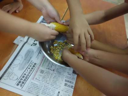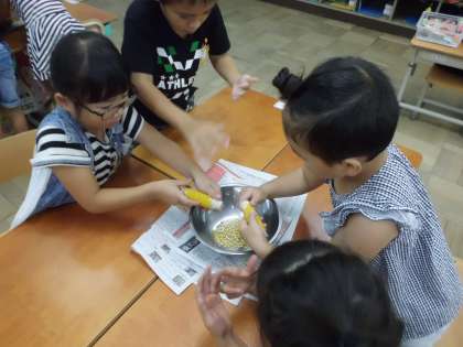 今日は,秋のポップコーンパーティに向けて,収穫したポップコーンの種を芯から外す活動をしました。初めて体験した子も多く,「わあ〜,こんなに簡単にとれたよ。」「こうすると,上手にとることができるよ。」と自分たちなりの発見や喜びをお互いに伝えあっている姿が微笑ましかったです。2年生と一緒にポップコーンパーティができる日を楽しみにしている子どもたちです♪
